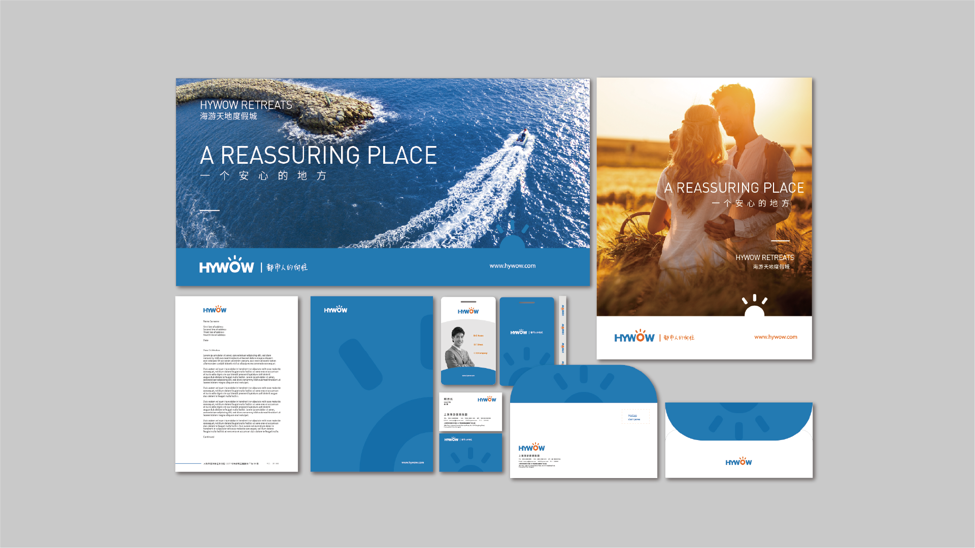 和與德根據海游天地度假城的定位和產業運作模式,將其山水競秀的自然風光、國際先進的度假理念和倡導的舒適便捷的生活方式融入品牌標志設計之中。
