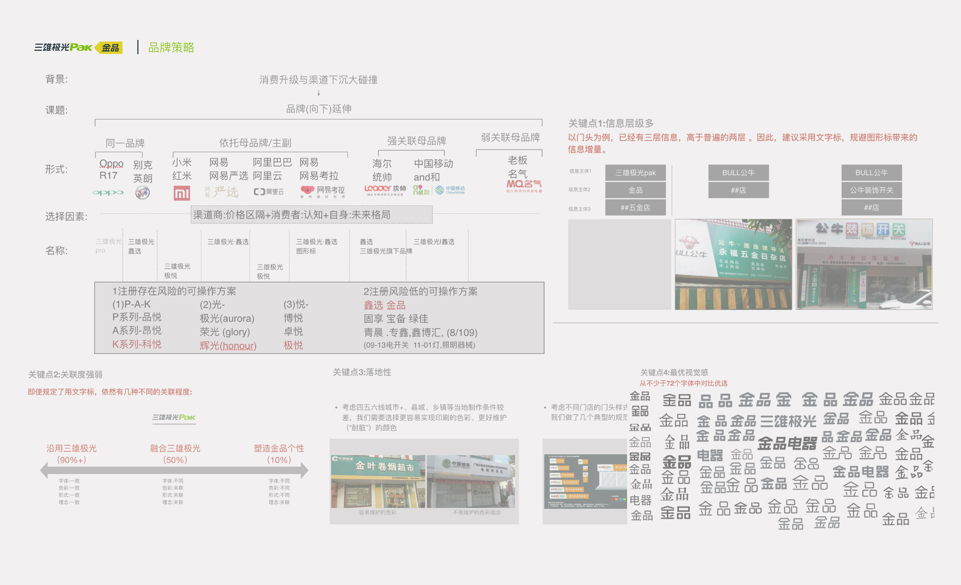 三雄極光布局進軍五金市場,滿足廣大三四五線及以下市場的需求。是否需要建立新品牌, 以及如何處理新品類與三雄極光照明之間的關系, 是此次項目的重難點。和與德在兼顧渠道商與消費者的利益下, 建議客戶創建新的子品牌, 與原三雄極光組合使用(即采用主副品牌模式)。我們從“行業”“產品”“品牌”綜合考慮, 為客戶定制名稱。