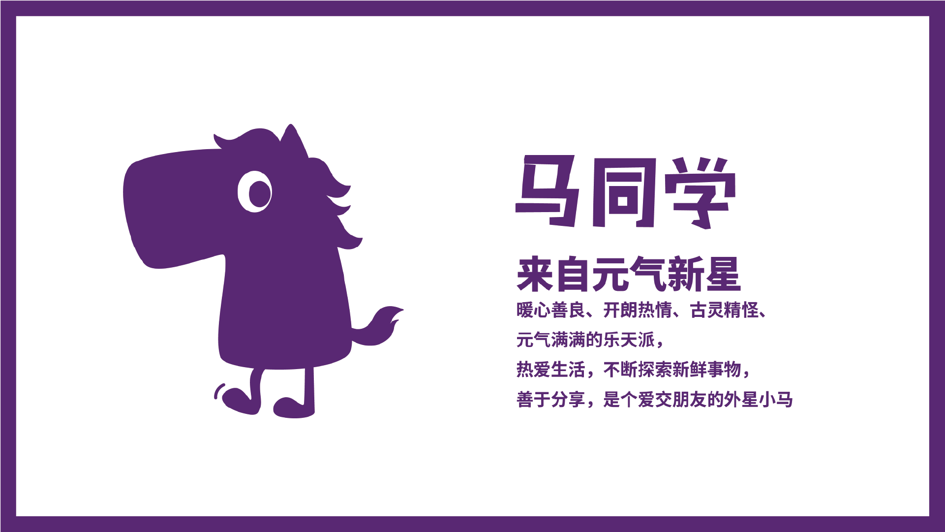 來(lái)自元?dú)庑滦堑鸟R同學(xué),是一位暖心善良、開朗熱情、古靈精怪、元?dú)鉂M滿的樂(lè)天派。他熱愛(ài)生活,不斷探索新鮮事物,善于分享,是個(gè)愛(ài)交朋友的外星小馬。